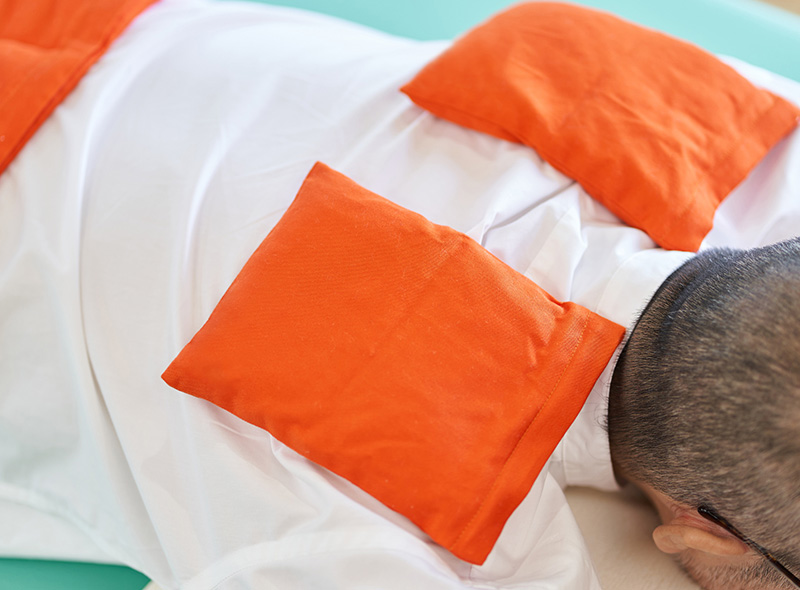 灸治療では、よもぎの葉を乾燥させて作られたもぐさと呼ばれる天然素材を用いて燃焼させ、その際に発生する心地よい温熱によって、体の特定のツボ(経穴)に対して丁寧に刺激を与えていきます。当院では、直接肌に触れることのない間接灸という安全な方法を採用しているため、やけどの心配は一切なく、患者さまに安心して施術を受けていただくことができます。