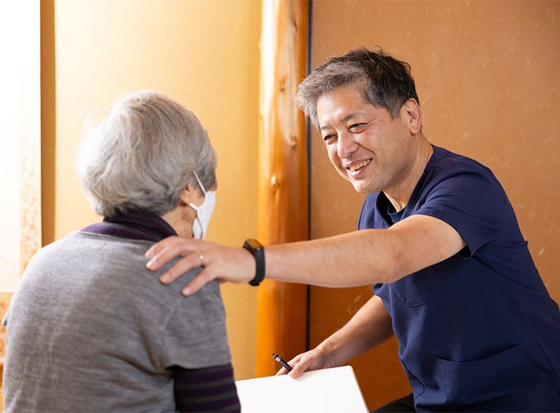 ご予約の日時に、鍼灸師がご自宅や施設へ直接お伺いします。お身体の動きや痛みの部位、日頃の過ごし方を細かく確認し、どのような施術を行うかをわかりやすくお伝えします。